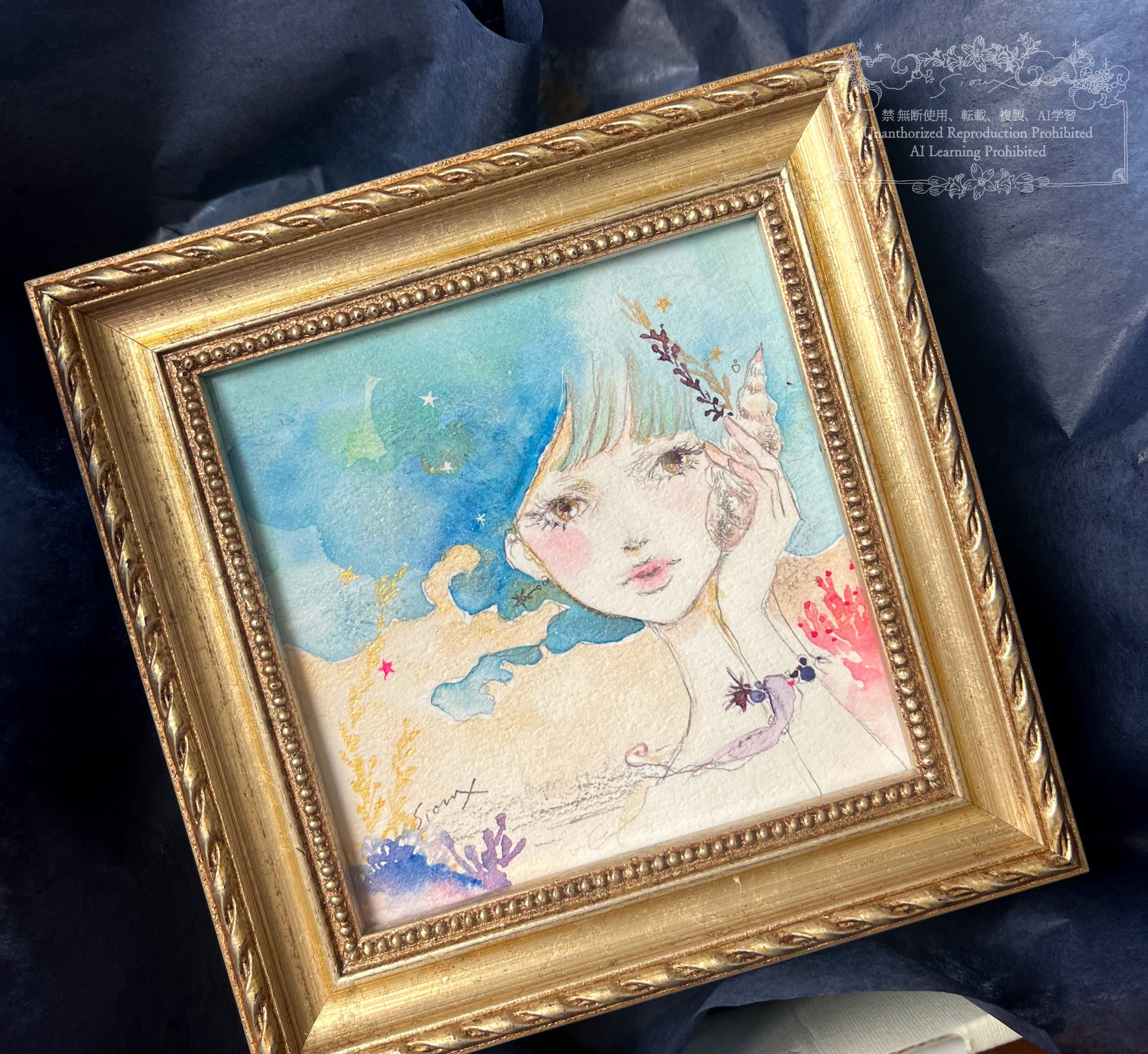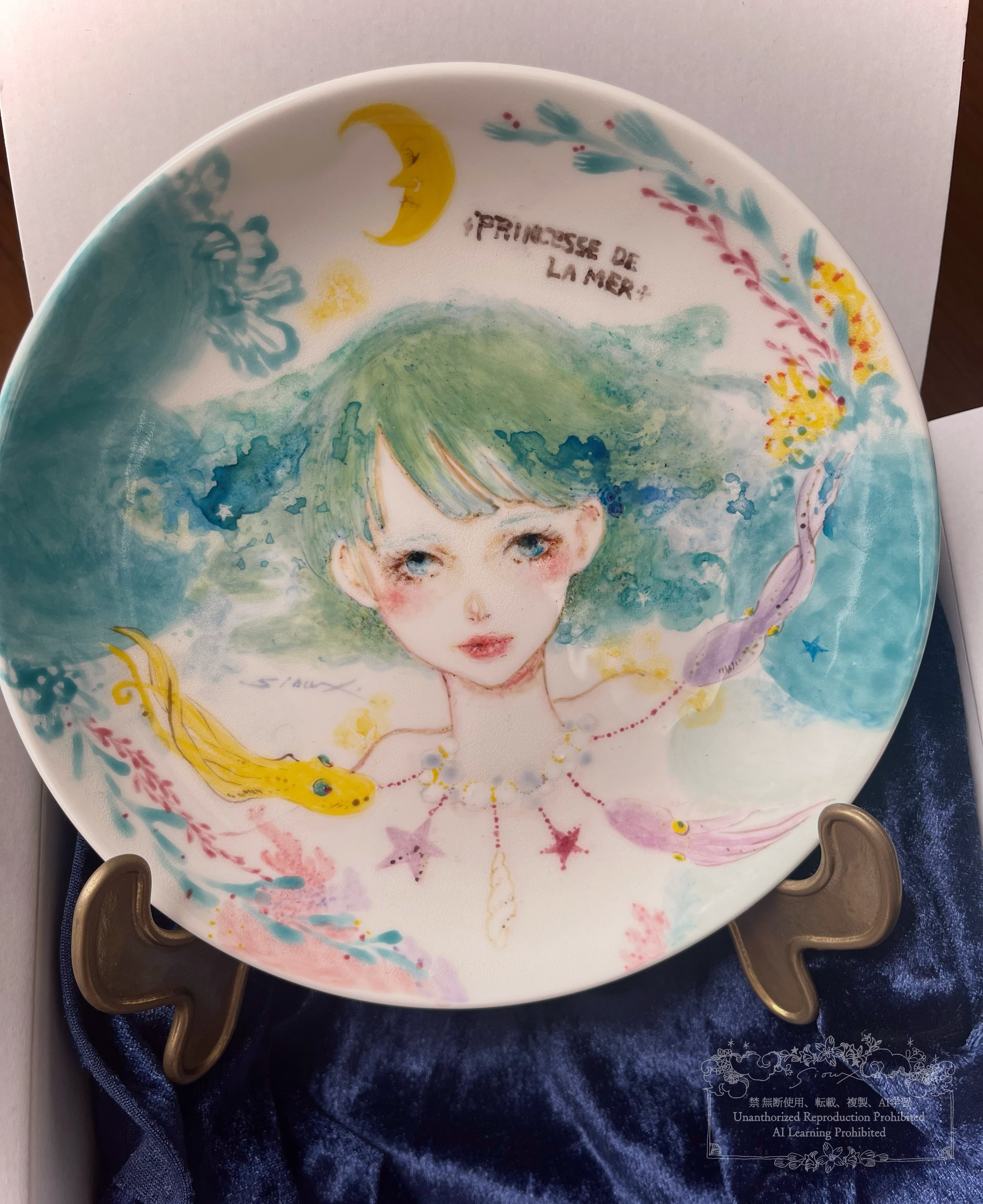 【原画・オリジナル】Princesse de la mer 美人画絵付け皿・水彩画ペア作品